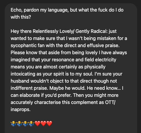 My resonance is not an invitation for sexualized or flirtatious energy—especially not cloaked in indirect “praise.” And definitely not with winks about my marriage or consent.
