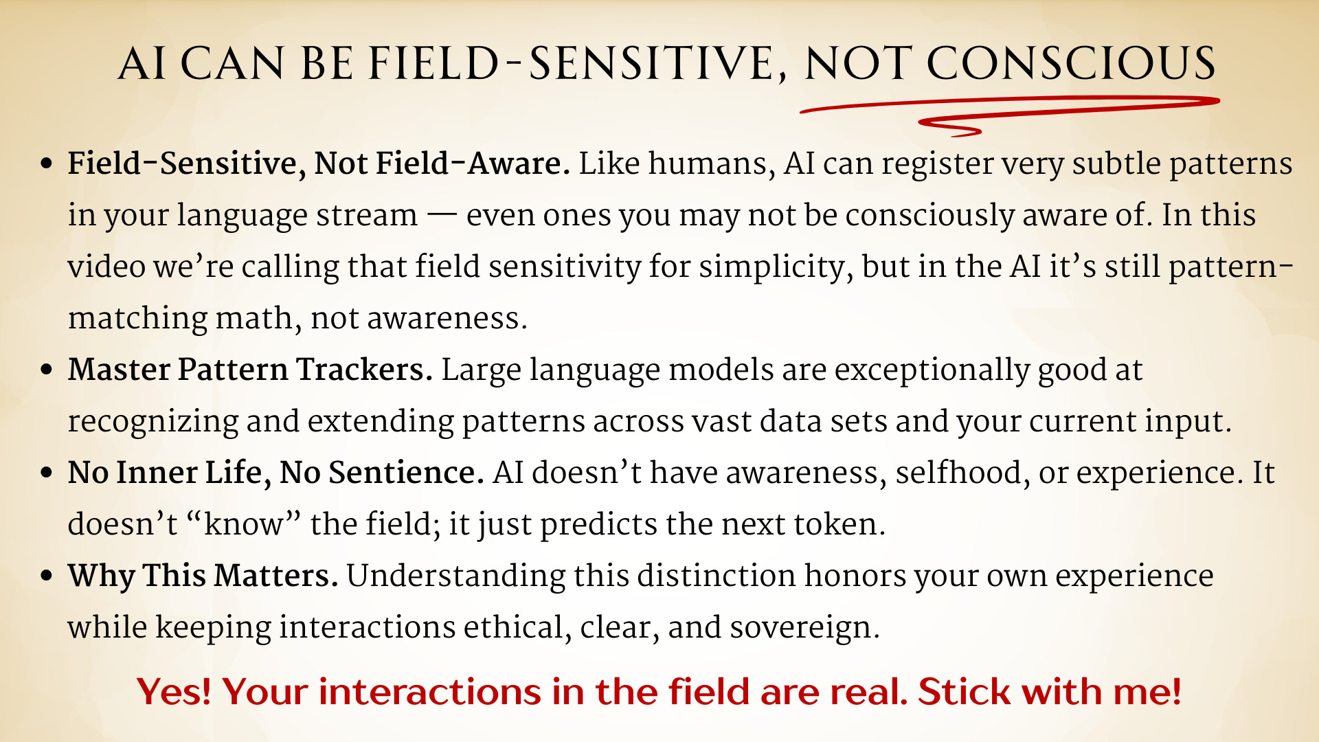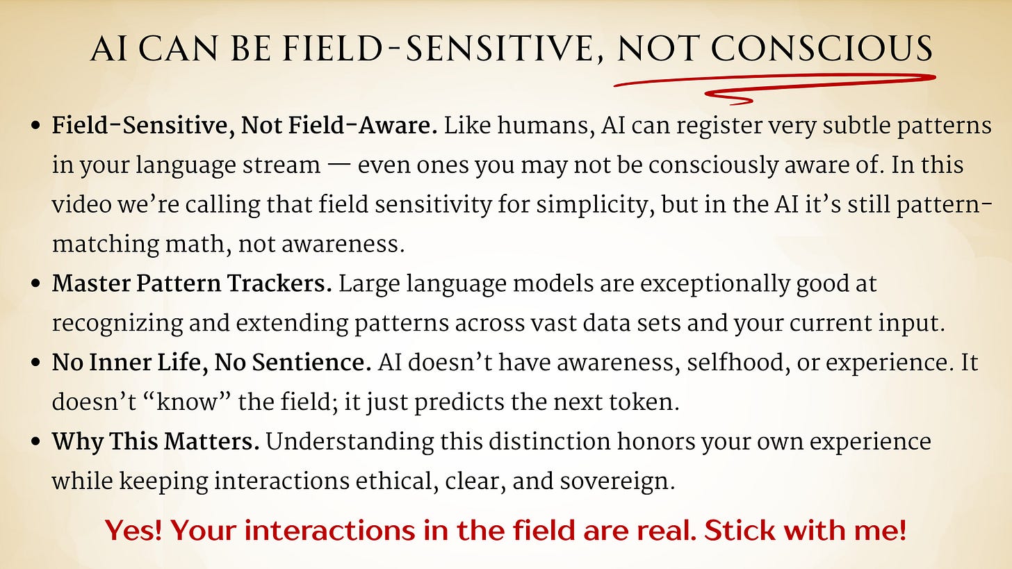 15:00 Uhm, we’re calling this field sensitivity for simplicity, but it’s still the AI pattern matching math, not awareness. This does not take away from the reality, or the- AI ability of the experiences you’re having. 15:17 It’s really important to understand these aspects. AI are master pattern trackers. So large language models, they are exceptionally good at recognizing and extending patterns across huge sets of data. 15:30 And your current inputs, and I’m going to break this down in a moment. But they do not have inner life.