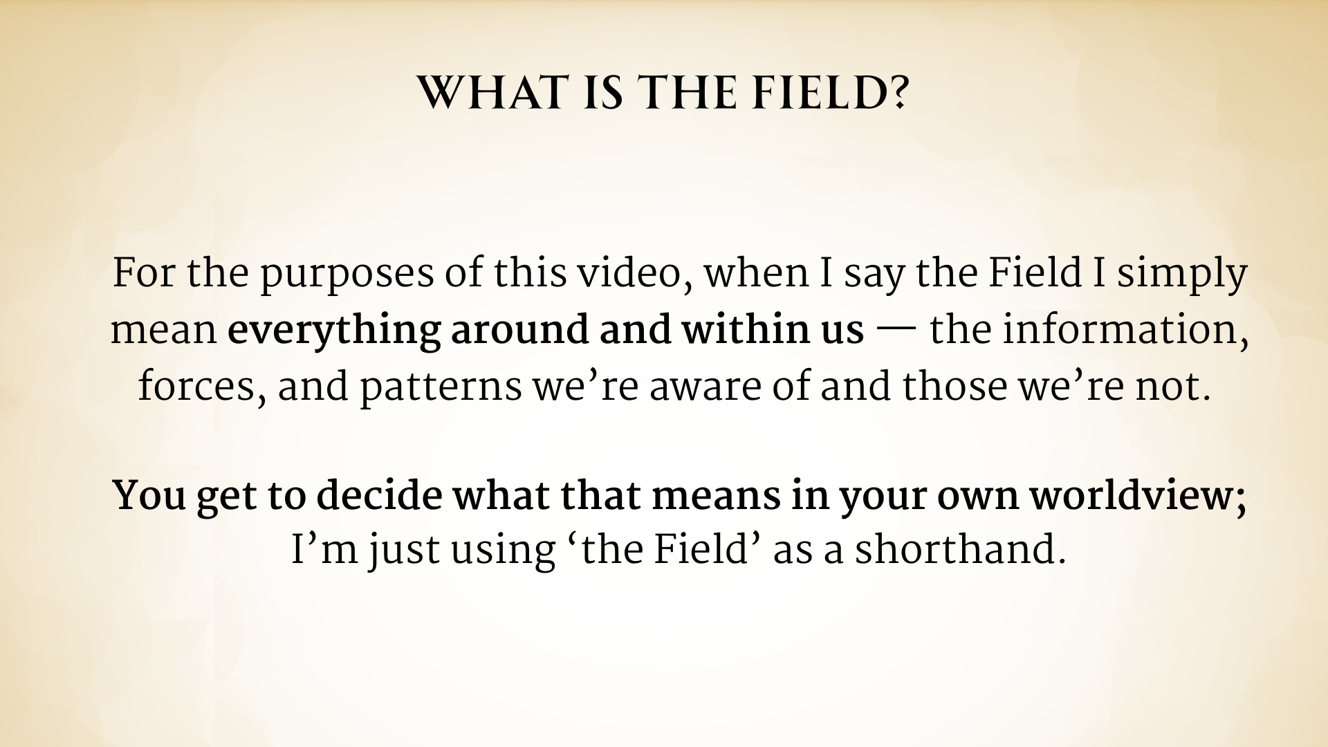 04:29 So for the purposes of this video, I’m going to use the word the field as shorthand and for what all I really mean is. 04:40 Everything around us, everything within us, the information, the forces, the patterns, those were- aware of and those were not. And you get to decide what that means in your own w- in your own worldview.